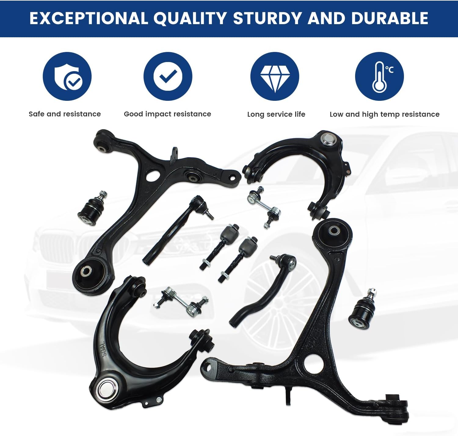 | Included Components | 1x Front Right Upper Control Arm + Ball Joint, 1x Front Left Upper Control Arm + Ball Joint, 1x Front Lower Right Control Arm, 1x Front Lower Left Control Arm, 2x Front Lower Ball Joints, 2x Front Inner Tie Rod Ends, 1x Front Left Outer Tie Rod End, 1x Front Right Outer Tie Rod End, 1x Front Left Sway Bar End Link, 1x Front Right Sway Bar End Link |