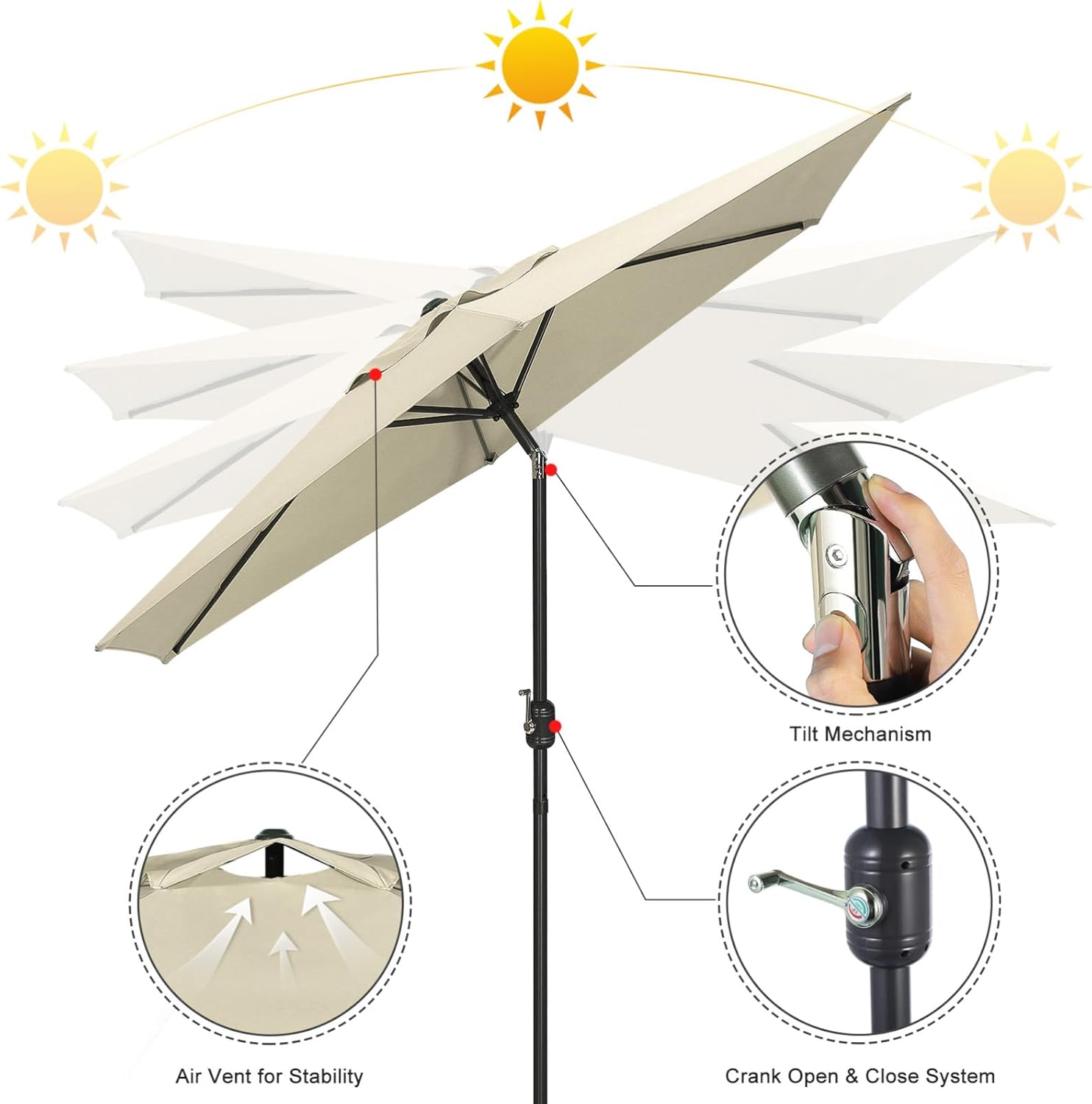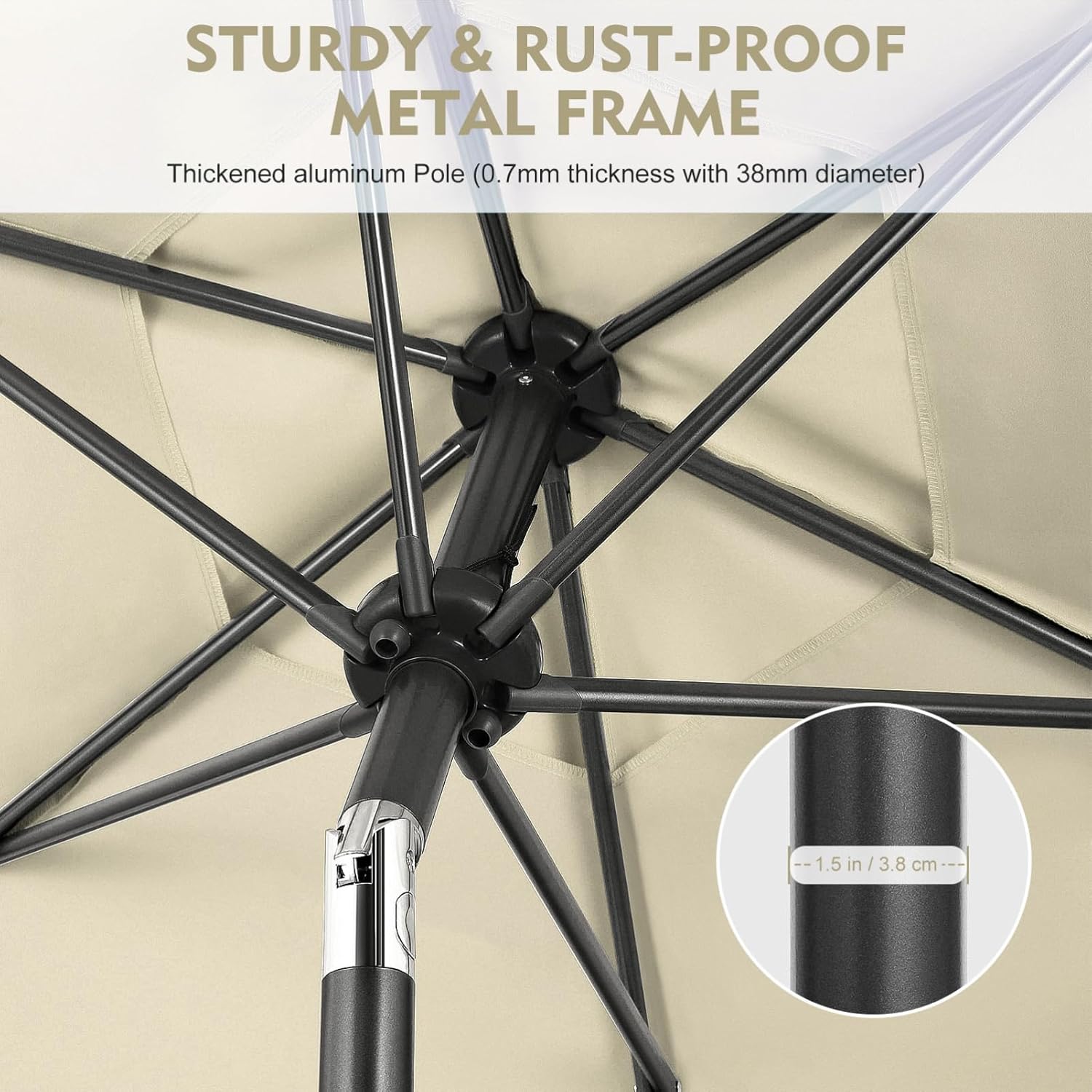 Feature- Color: .- Material: polyester with PA coating, aluminum, iron.- Height: 96 in / 244cm- Open diameter: 9 ft- Umbrella pole: 38 mm (diameter), 0.9 mm (thickness)- Umbrella rib: 12x18 mm (transection)Package Including1 x 9ft Patio Umbrella