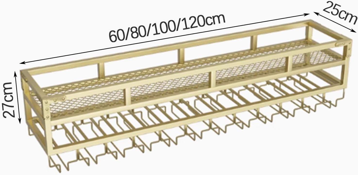 Product Description:LED light design, not only can you take things conveniently when the light is low, but also can decorate your room at night.The top layer is equipped with a metal guardrail to prevent wine bottles and glass bottles from falling.The durable metal wine rack has a rich gold/black finish, which can complement various home decorations, and the wall-mounted design can save space on the table and floor, making your room tidier.The hanging rack can not only hold wine, but also hang various items, plants, mugs, photo frames, books, etc.The wine rack can be installed at home, kitchen, restaurant, study, bar or wine cellar.Specifications:Name: Wine RackMaterial: IronFeatures: Strong and DurableSize: Single Layer - Length 60/80/100/120 cm, Width 25 cm, Height 14 cmDouble Layer - Length 60/80/100/120 cm, Width 25 cm, Height 27 cmColor: Black, GoldPackage Includes: Wall-mounted Wine Rack x 1 (Wine Bottles Not Included)Warm Tips:Please allow 1-2 cm difference due to manual measurement.Due to factors such as light, monitor, etc., the actual item received may be different from the picture. Please refer to the actual item.