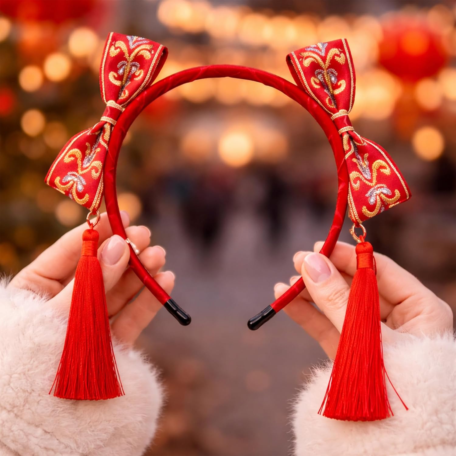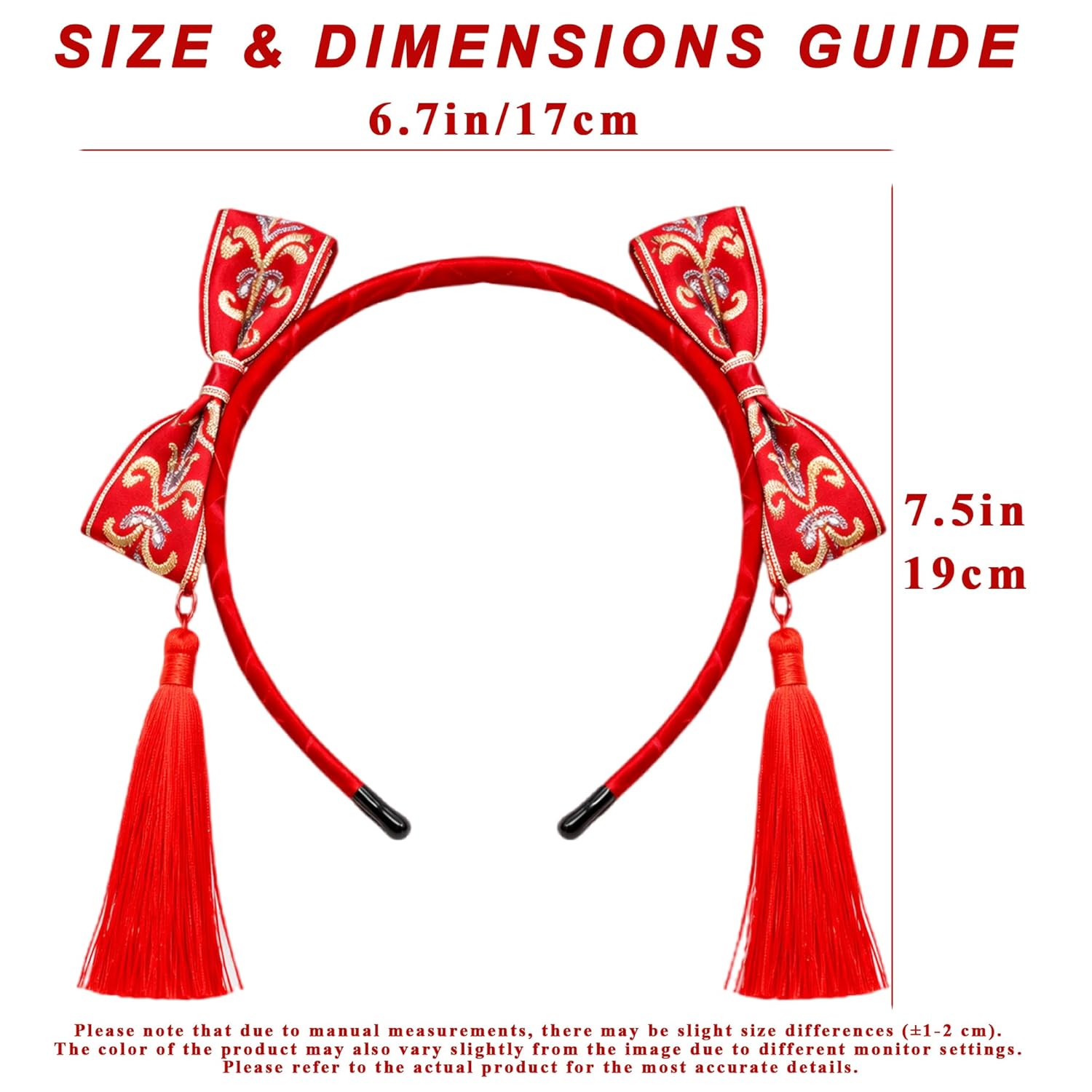Celebrate the season with a touch of color and movement using this festive Chinese New Year headband designed to capture the joyful spirit of the holiday. Crafted from red polyester with soft flocked fabric, the accessory brings warmth and brightness to your outfit, while the tassels sway gently as you walk—adding a sense of motion that feels lively and symbolic. At 6.7 x 7.5 in, it offers a balanced, comfortable fit that’s easy to wear throughout celebrations, whether you're attending gatherings, enjoying Lunar New Year festivities, or styling for themed photos. This Lunar New Year headband blends modern comfort with cultural-inspired charm, making it a meaningful addition to your seasonal wardrobe. The flocked texture adds depth and softness, creating Chinese New Year hair accessories that feel expressive without being overwhelming. Each tassel detail catches attention naturally, bringing a traditional touch to your look as you move through the day. Lightweight and flexible, the band fits securely without pressure, allowing you to enjoy dinners, parties, or festive events with ease. Its bright red hue makes styling simple—pair it with elegant dresses, qipao-inspired outfits, or everyday ensembles to bring good fortune–themed energy into your appearance. Whether you enjoy bold accessories or prefer subtle touches, this red tassel headband offers a unique way to express seasonal cheer. Designed for durability, it maintains its shape and color for repeated yearly use. Add this Chinese New Year headband to your festive wardrobe and bring joyful, symbolic energy into every celebration.
