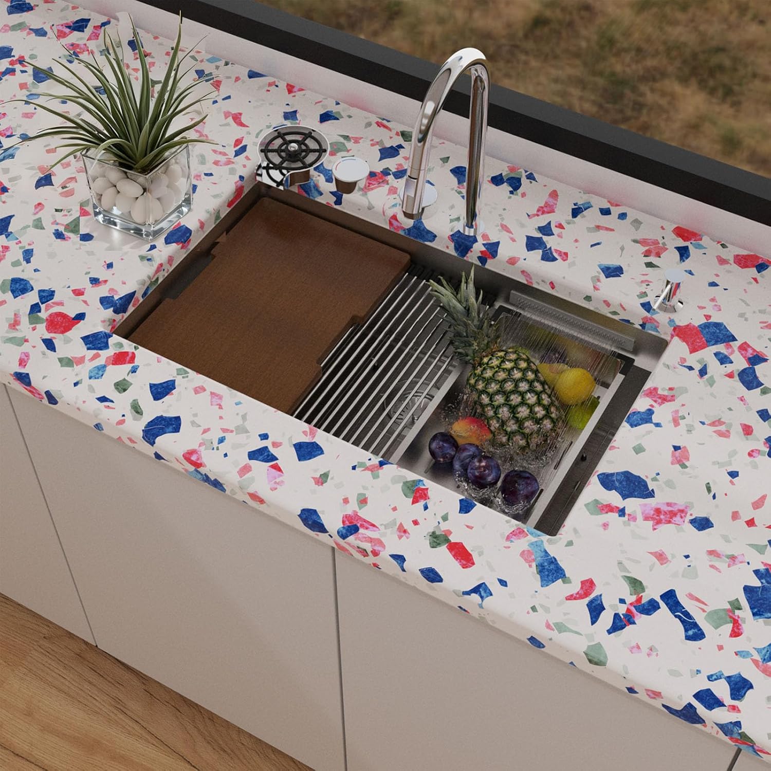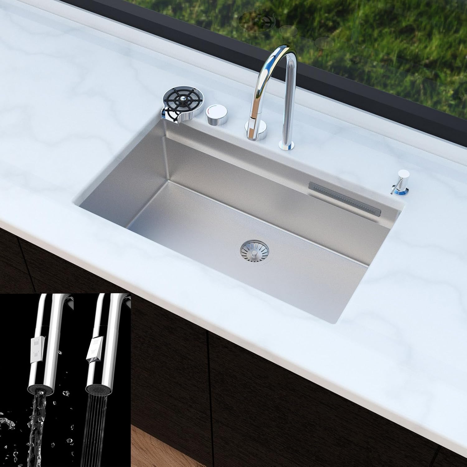 | Included Components | ①pull-down faucet ②cup washer ③soap dispenser ④cutting board ⑤washing colander ⑥roll-up drying rack ⑦bottom grid ⑧drain set |
