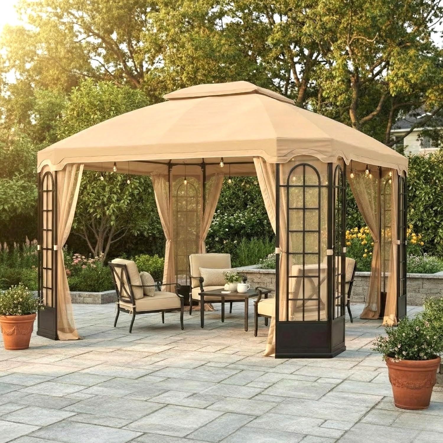 Upgrade your outdoor space with Garden Winds replacement canopy top, custom-designed for the Terrace Gazebo sold at Sears, K-Mart and various retailers. Made from durable 350 Denier Polyester with Riplock Technology, this canopy features reinforced gridlines to resist tearing, UPF 50+ UV protection, and a water-resistant coating for reliable all-weather performance. Color: Classic Sand Beige (different from original). It's also CPAI-84 fire-retardant compliant, for added protection. Guaranteed to fit model number: L-GZ454PST-C, A111010900. SKU number: 028W005281617001, 0-05281617-0. - please verify your gazebo's model before ordering. Canopy top only; frame, netting, and curtains not included.