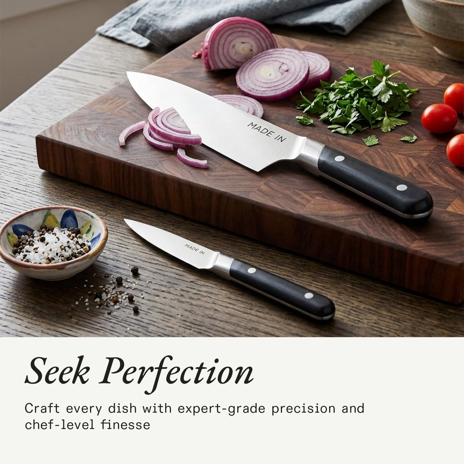 Crafted in Thiers, France, the birthplace of the chef’s knife, this 2-Piece Knife Set is designed for precision, versatility, and durability. Each knife is full tang and fully forged, meaning it’s crafted from a single rod of stainless steel for perfect balance and professional-grade sharpness. The optimized edge geometry enhances cutting performance while extending the blade’s lifespan, reducing the need for frequent sharpening. The set includes an 8” Chef Knife, an all-purpose essential for slicing and dicing, and a 3.8” Paring Knife for intricate prep work and fine slicing. Finished with a Black ABS or Olive Wood handle, these knives are built for durability, impact resistance, and a comfortable grip. Designed for both professional chefs and home cooks, this set delivers exceptional sharpness, strength, and performance in every cut.