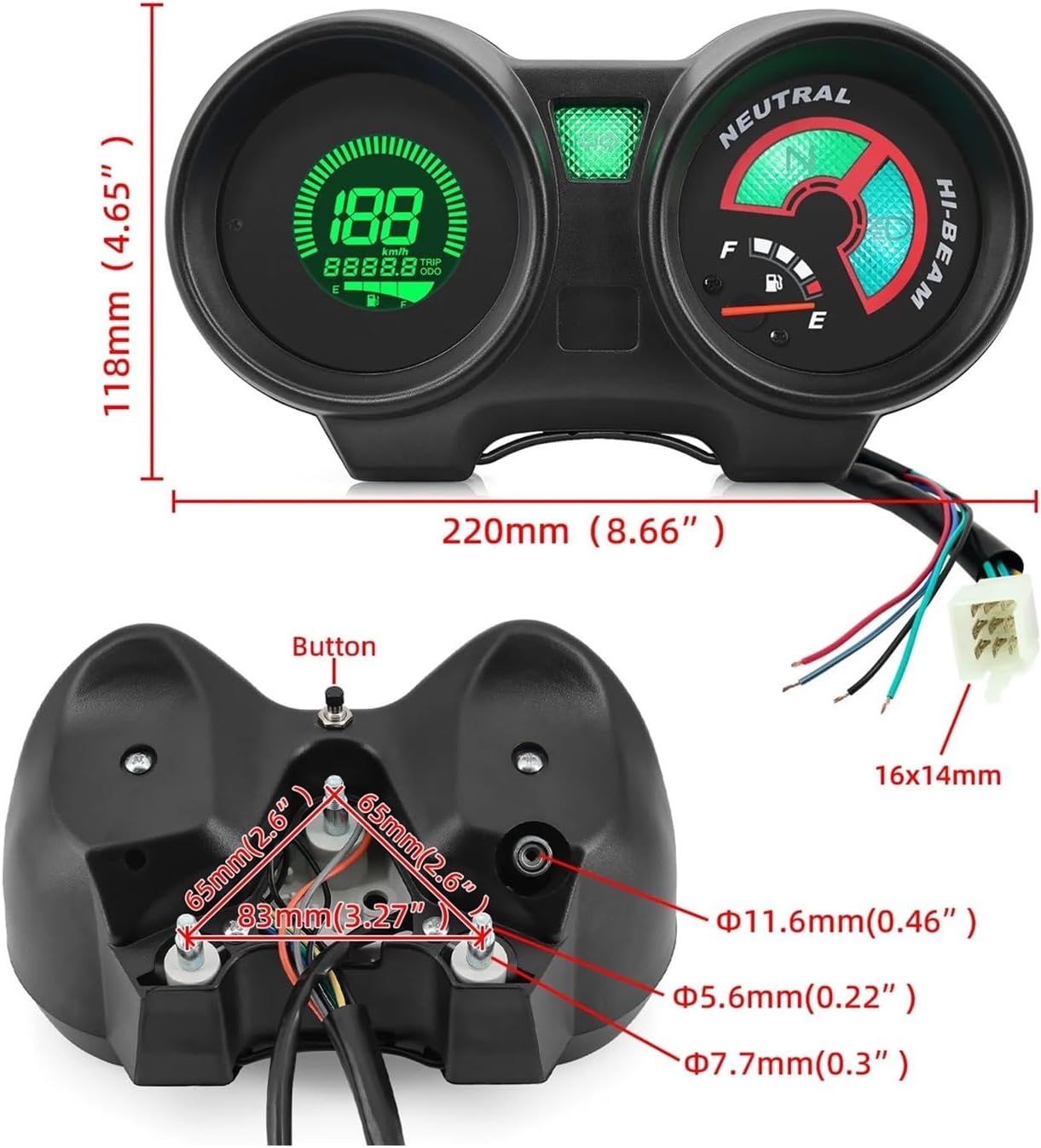 Adjustable 7 Colors Digital Tachometer Universal Fuel Level Gauge Motorcycle Odometer Meter Motorbike Dashboard Accessories1. Vehicle speed: equipped with Hall sensor;2. Fuel level gauge: 10 -97 ,Features :1. Speed: The maximum displayed speed is 199km/h;2. Mileage: The maximum display mileage of the total mileage ODO is 99999km, and the large display and small mileage can be switched,The maximum displayed mileage of the subtotal is 999.9km;3. Oil quantity: with 4 lines of oil quantity display;4. Backlight: backlight can be adjusted with buttons;Package Includes:1 x Motorcycle TachometerModel Name : Motorcycle accessoriesMaterial Type : PlasticFunction: The motorcycle odometer is exquisite and smooth, safe and environmentally friendly. Friendly interface, strong practicalityFunction: The motorcycle tachometer can help you better understand the status of the motorcycle engineFunction: The motorcycle tachometer is not easy to age and has a long service lifePractical: The motorcycle tachometer is finely crafted, high-end and atmospheric, and the reading is accurateHope you can buy your favourite products in the shop, welcome to the next visit.