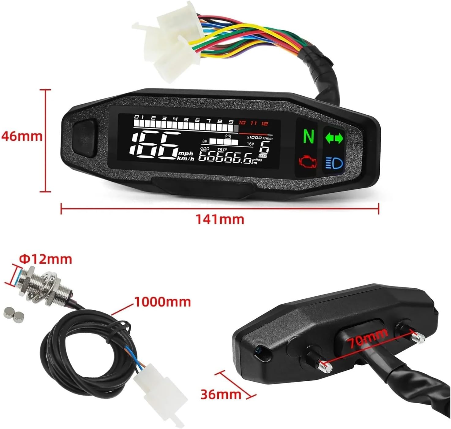 Motorcycle Digital Dash Universal Tachometer KM/H With Turn Signal Light Voltmeter Oil Gauge Tachometer Tacho MetersThe digital instrument cluster with turn signals improves visibility and safety when riding at night, making it a must-have accessory for motorcyclists.The voltmeter and oil gauge assembly provides real-time information on the status of the motorbike's and oil, promoting better maintenance and performance .The tachometer displays the engine's revolutions per minute (RPM), providing information to understand the motorbike's performance Universal Motorcycle Tachometer RPM Tachometer Tachometer MPH KMH Tachometer Digital Odometer with Sensor For MotorcyclesDescriptipn:1.Max speed : 199km/h2.Max trip: 999.9km3.Max rpm:1200 rpm4.blue wire ~ High beam5.yellow-red ~4 level6.blue-red~2 level7.blue-white~RPM8.orange~left turning light9.green~power10.black~positive electrode11.yellow-voltage 5v12.brown-white~5 level13.green-black~3 level14.~1 level15.red~speed16.green-red~ N level17.light blue~right turning lightSpecial Features : GPS TachometerMaterial Type : plasticItem Diameter : 15inchItem Weight : 0.38kgItem Height : 11inchItem Width : 11inchItem Length : 22inchHope you can buy your favourite products in the shop, welcome to the next visit.