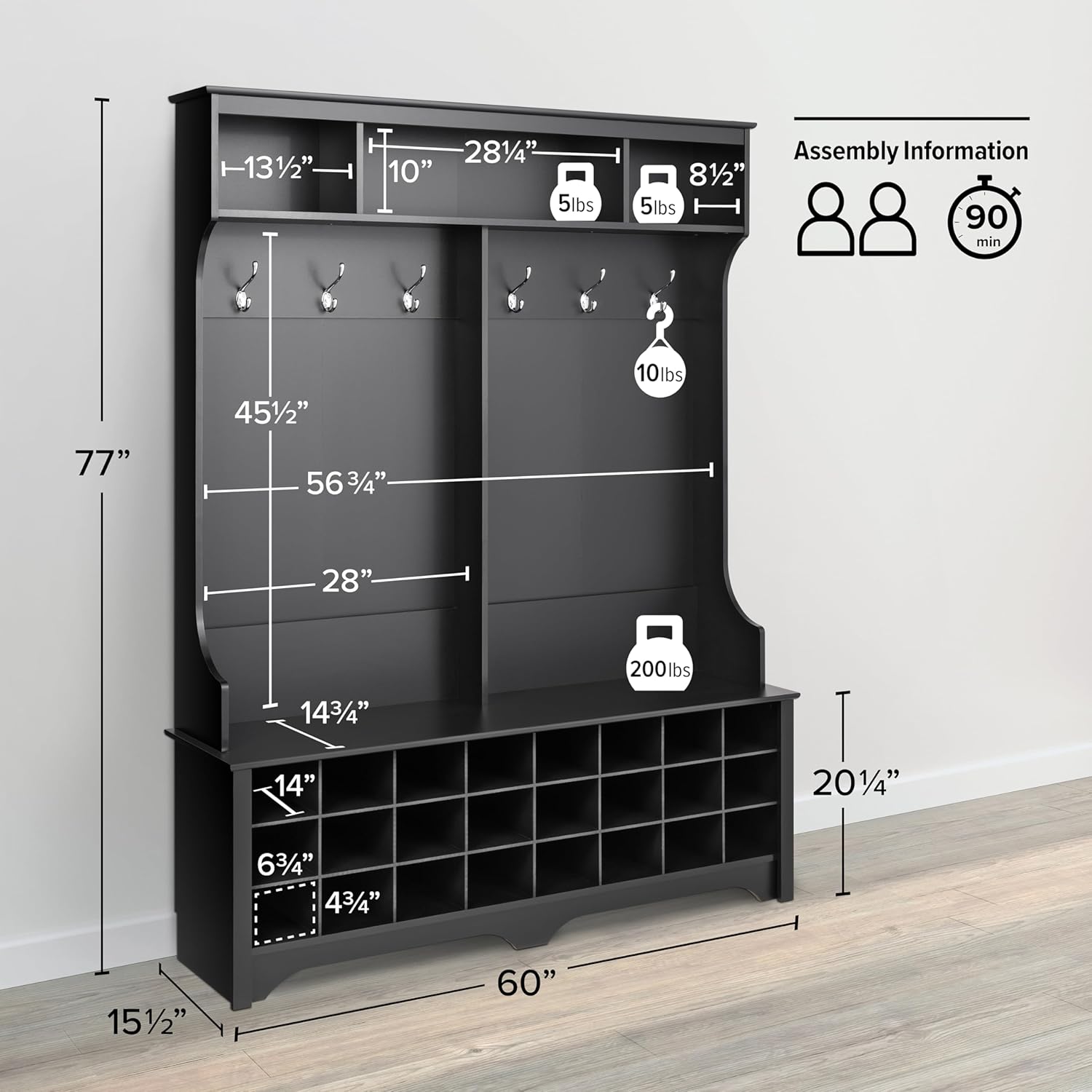 Discover a new realm of organization with our Prepac 24 Shoe Cubby Wide Hall Tree with Bench & Coat Hooks. This 3-in-1 mud room organization and storage bench delivers on functionality and style, promising to spruce up any entryway. Its classy design features a wide mud room bench complemented by an entryway coat rack shoe bench, ideal for streamlining your morning routine. The hall tree is adorned with 24 shoe cubbies tucked under the bench, each well-suited for a pair of shoes up to men's size 13, transforming it into a mud room bench with shoe storage. This hall tree for entryway with storage boasts six double coat hooks and additional storage shelves overhead, ideal for hanging coats, scarves, or bags. With its efficient design, this entryway coat rack shoe bench keeps your space uncluttered without consuming too much room—an ideal foyer bench for entryway. Crafted in North America from non-toxic, laminated composite woods, our entryway storage bench with coat rack is durable for long-lasting use. It arrives flat-packed for your convenience, complete with an instructional booklet and an anti-tip restraint for safe assembly. As an epitome of a closet organizer system, our halltree entryway with storage bench measures 15.5""D x 60""W x 77""H for efficient storage. Each cubby measures 14""D x 6.75""W x 4.75""H, providing enough space for your shoe cabinet for entryway slim. This shoe storage cabinet for entryway slim makes an ideal choice for those aiming to keep their home organized. Explore the versatility of our Prepac 24 Shoe Cubby Wide Hall Tree with Bench & Coat Hooks, the perfect coat rack with bench, designed with you in mind, and embrace a clutter-free home today.