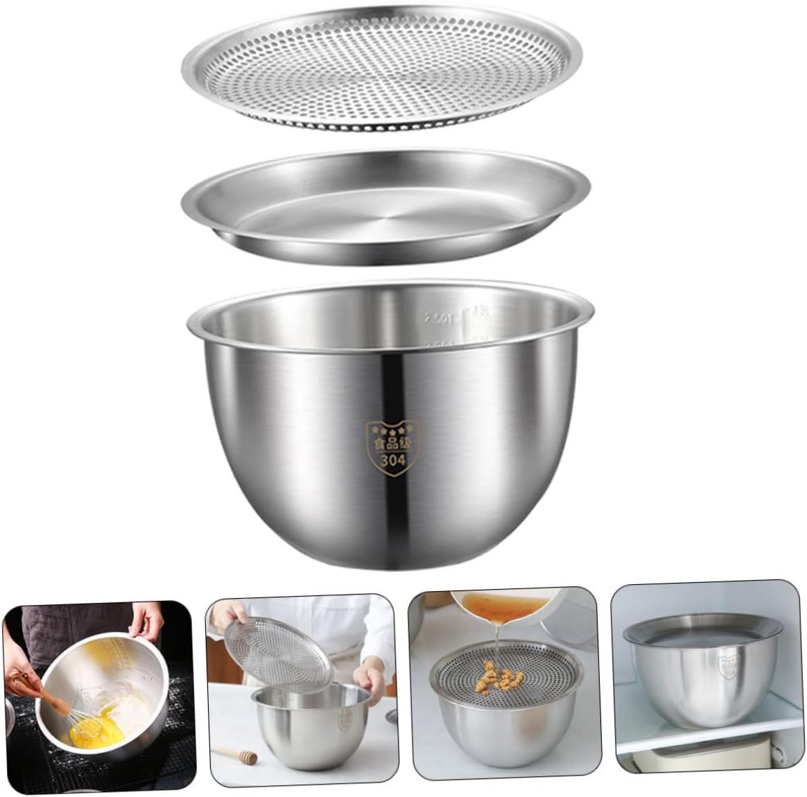 Package List 1 x bowl 1 x lid 1 x mesh lid Characteristics -Size:21.80X21.80X13.00cm/8.57X8.57X5.11in rice rinsing bowl -Color:Silver fruit and vegetable washing bowl -Product Info:Drain basin set -Material:Stainless steel fruit and veggie washing bowl -The reasonable design of this washing basin allows for easy storage and saves space in your kitchen cabinets or drawers kitchen supply. -The practical washing basin with colander kit can be used for draining, filtering oil, washing rice, making salads, cooking, and beating eggs vegetable wash basin. -The fine craftsmanship of these bowls a smooth and safe user experience, making them a reliable and practical choice for any home cook rice washing basin. -You can select the perfect bowl for each task, whether you need a small bowl for beating eggs or a larger one for making salads rice washing strainer. -The stainless steel material used in the construction of these bowls durability and easy cleaning, making them a addition to your kitchen wash rice sieve.Goods Descriptionstainless steel colander bowl The multi-purpose vegetable washing basket is made of stainless steel, can be stacked storage.rice washing sieve The basket can be used for storing and washing fruits and vegetable with good water filtering effect.stainless steel colander sieves It doesn't take up space