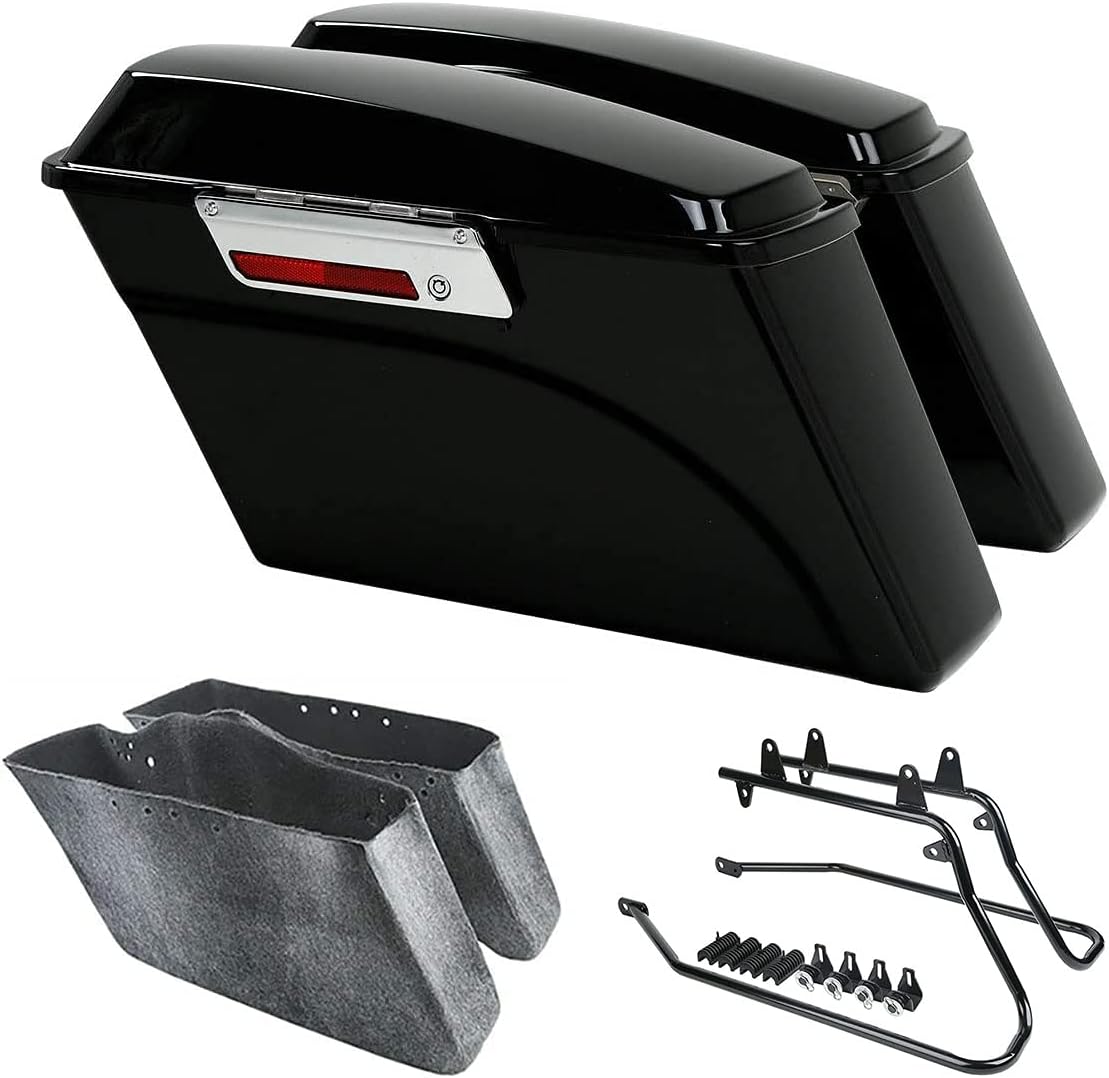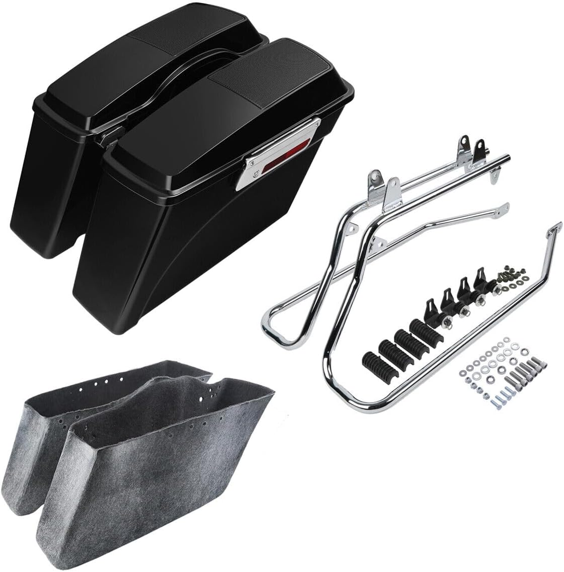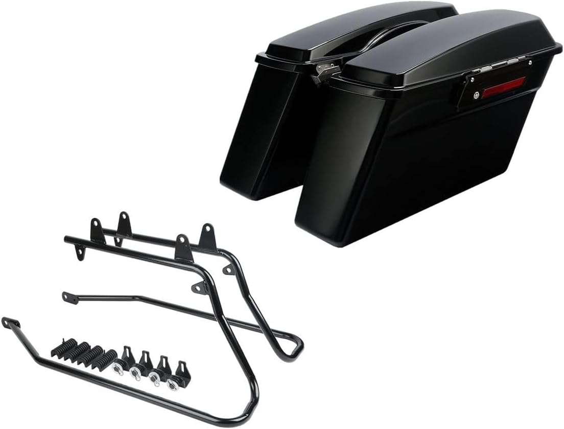 Aftermarket 100% Brand New Easy to install And No install instructions Saddlebags: Material: Very High Quality ABS Size : As picture Shown. (outside dimension measurements) Conversion Kit: Four rubber bottom supports Black finishes mounting hardware Size: As the Picture Show Exhaust must sit below your rear axle Turn signal relocation IS required (excludes Deluxe models) Fitment: Fit For Harley Softail Heritage/Deluxe Models 1984-2017 (except softail slim, softail deuce models) Package Included: Box1: A pair Black saddlebags With Keys Latch Box2: A pair of heavy duty metal brackets With mounting hardware