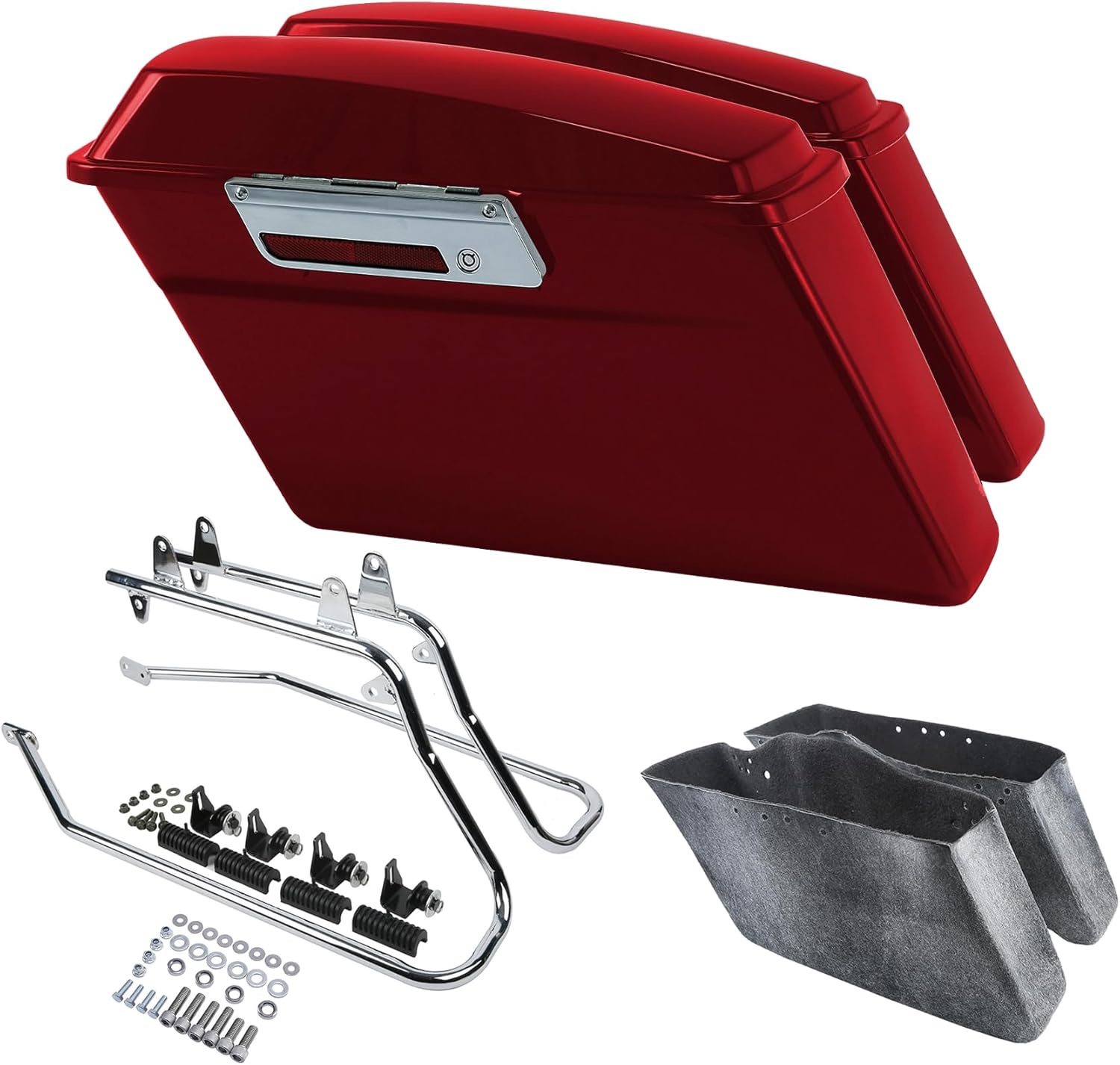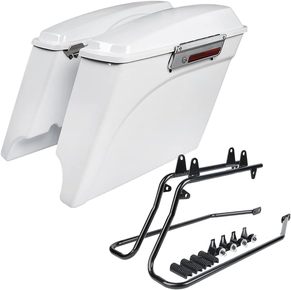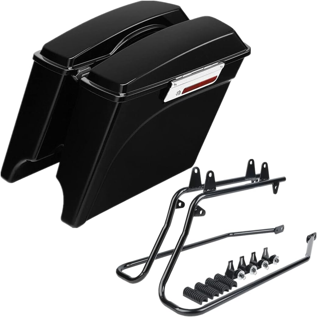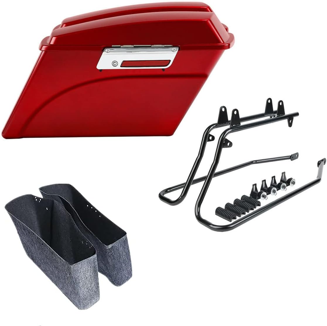 Aftermarket 100% Brand New Easy to install And No install instructions Saddlebags: Material: Very High Quality ABS Size : As picture Shown. (outside dimension measurements) Conversion Kit: Four rubber bottom supports Black finishes mounting hardware Size: As the Picture Show Exhaust must sit below your rear axle Turn signal relocation IS required (excludes Deluxe models) Fitment: Fit For Harley Softail Heritage/Deluxe Models 1984-2017 (except softail slim, softail deuce models) Package Included: Box1: A pair Black saddlebags With Keys Latch Box2: A pair of heavy duty metal brackets With mounting hardware